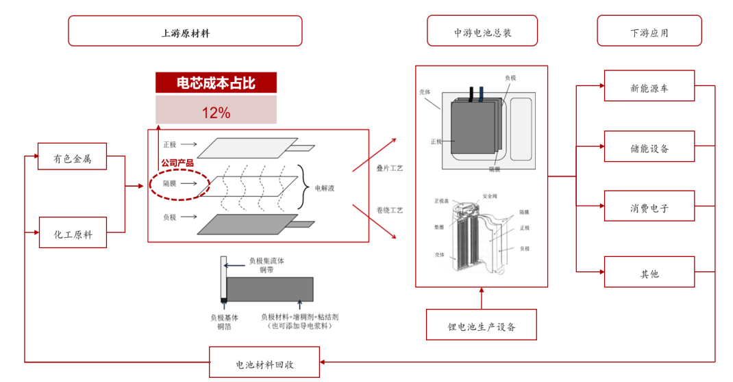 隔膜处于锂电产业链上游,为锂电池四大核心材料之一,约占电芯成本的12%。下游新能车、储能、消费电子三大应用领域共同催生锂电池需求高增长。